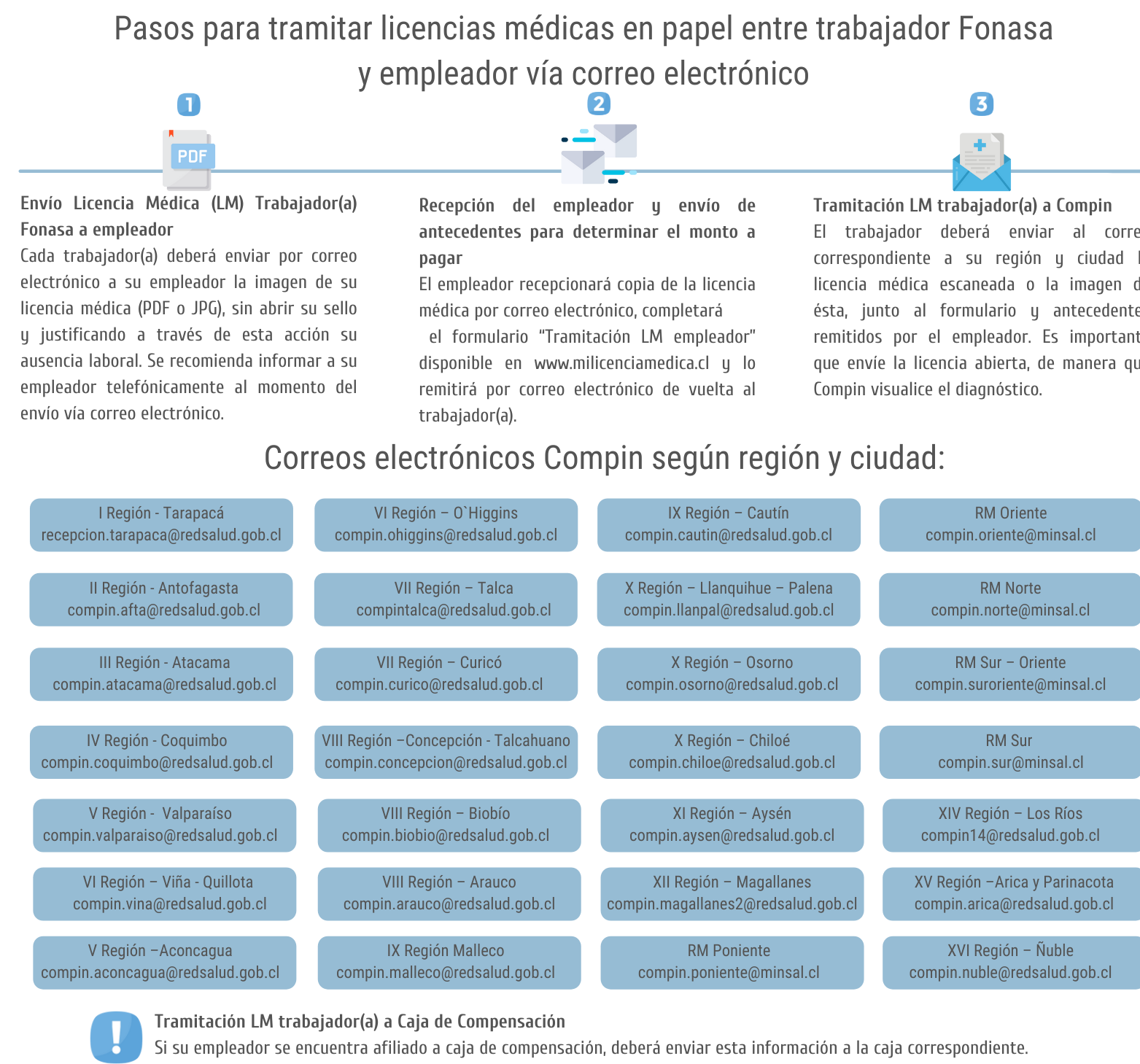 Si bien a partir del 1 de enero de 2021 comenzó a regir la obligatoriedad en la emisión de licencia médica electrónica, dentro de la normativa existen excepciones en que los prestadores podrán emitir licencias médicas en papel. En estos casos se recomienda a los usuarios realizar el trámite entre trabajador Fonasa y empleador por correo electrónico, según el siguiente flujo: